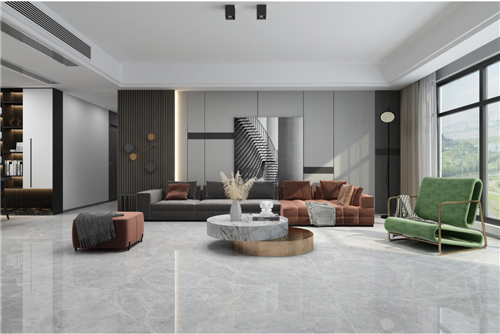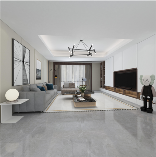 开放式客餐厅在地砖上可以选用一种比较随和的色彩作为搭配,暖灰色调的地砖纹理犹如流水般的灵动,与亮色沙发做搭配,让空间瞬间有了暖度,并有质朴的氛围。
