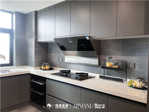 烟灰为底,光感流动,金属银丝无规律镶嵌,碎了满室的浪漫与质感。仿佛就能在简约洗练的空间中,捉住时光短暂搁浅的灵动多变。令人在厨房这个最是人间烟火之处,享受精致生活的舒怡。