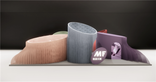 将军岩板2020设计周展位设计理念源于“万物皆可”的概念,展位整体结构形状呈“圆形”,圆是自然哲学,容纳世间万物,以“圆”的造型传递“造物,玩出可能”核心思想,传达岩板产品未来发展可以创造无限可能的核心理念,体现多元化、多模式、多领域全方位的发展将是将军岩板品牌发展的重要方向。展位两侧的多向旋转式造型,犹如一个高速旋转的火轮,寓意着企业在迅速发展的大好态势,展位的文化精神、视频呈现内容、物料展示都将始终贯穿展位的设计理念。