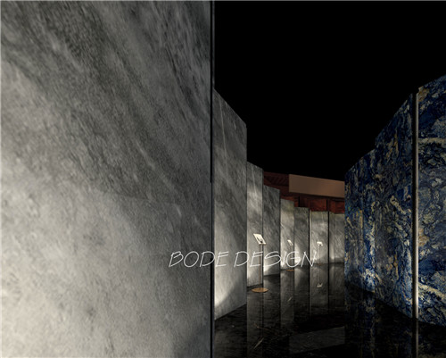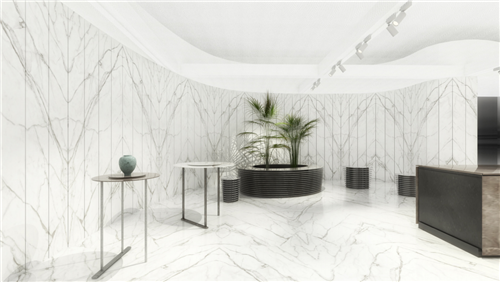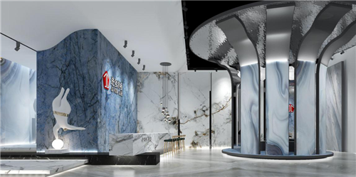 进强岩板展馆以“岩梦”为主题,利用沉浸式实景展现形式,将片状岩石植根于空间之中,运用大量理石纹理元素,呈现城市与自然多元融合的设计效果,旨在让观展者感受自然与城市共生,享受繁忙的都市生活中空间所带来的舒适与惬意。
