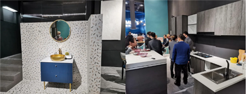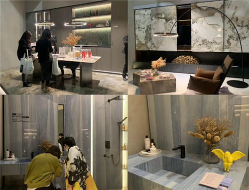 进入展位空间如同探索别人家高级神秘家居空间。水泥深灰的建筑墙面能够实现投屏轮播,宽阔的投屏区域结合轮播内容如同来到了生机盎然的庭院。进入家居空间里,橱柜、洗手台、餐桌、酒柜、电视柜、浴室墙面/浴室洗手台等,全岩板家居尽显主人家奢华高雅的生活情调。