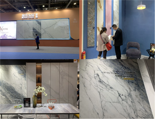 金丝玉玛K金岩板自第35届佛山陶博会期间重榜发布后,首次亮相线下展会。金丝玉玛瓷砖展位以高调的橘红色外立面“先声夺人”,主要展示K金岩板成品家具,如橱柜、酒柜、台面、餐桌、背景墙等。电光釉+闪光粉+金元素等多种核心独创工艺的相互叠加,使得K金岩板在岩板领域极具差异化竞争力,吸引了众多观展商观赏咨询。展位上还展示了部分K金4.0系列产品,亮眼的纹理色调令人惊艳不已。
