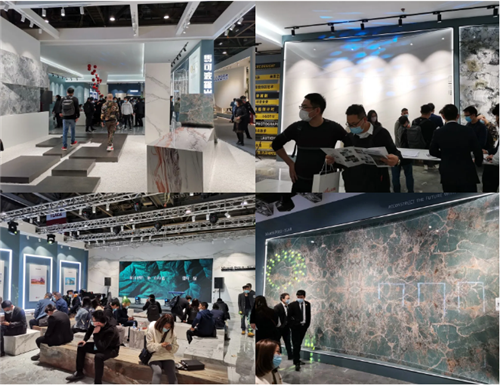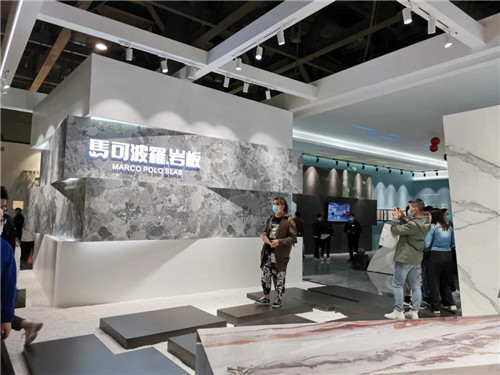 博德精工砖此次参展主要展示的晶刚玉•独体煅造石材产品,为了诠释“是纸醉金迷,还是回归本色”的主题,展位的沉浸式体验方式结合了视觉艺术、空间设计、光线等多种艺术方式,重塑新的空间理念。另外,展位上除了有“岩”值产品之外,还有美食与美女,号称米其林星级主厨与美女主播一并在现场作报道。