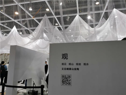 在本届广州设计周上,峨眉山金陶以“又见峨眉山金陶”为主题,通过充满智慧的文字组合“又+见=观”,巧妙地结合四川名山峨眉山元素,将岩板产品融入“观云、观山、观岩、观水”四大应用场景。具体说来,其展位设计和岩板产品完美融为一体:在灯光的照射下,顶部的白纱洒落点点星光,营造出人在丛林走的意境;运用平面构成和立体构成的表现手法,创造抽象化的峨眉山景,即板为山、岩为阶,运用岩板抽象化地表现山与石,运用波纹板表现一方峨秀水,从而达到观云、观山、观水的效果。