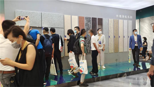 展位上展示了协进多款趋势潮流产品,规格有600x1200、750x1500、900x1800、800x2600等,其中还有备受关注的全能型岩板系列新品。花色丰富、规格齐全的产品体系让观众们大饱眼福。