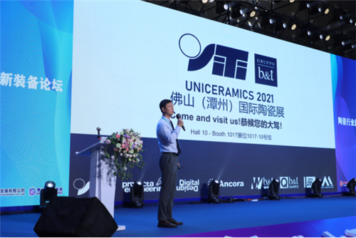 2.希望数码印刷设备有限公司梁文辉总监:介绍超宽幅岩板数码喷墨机、超高清岩板时代必备喷墨利器、超宽幅全数码无水施釉线、双排打印等内容。