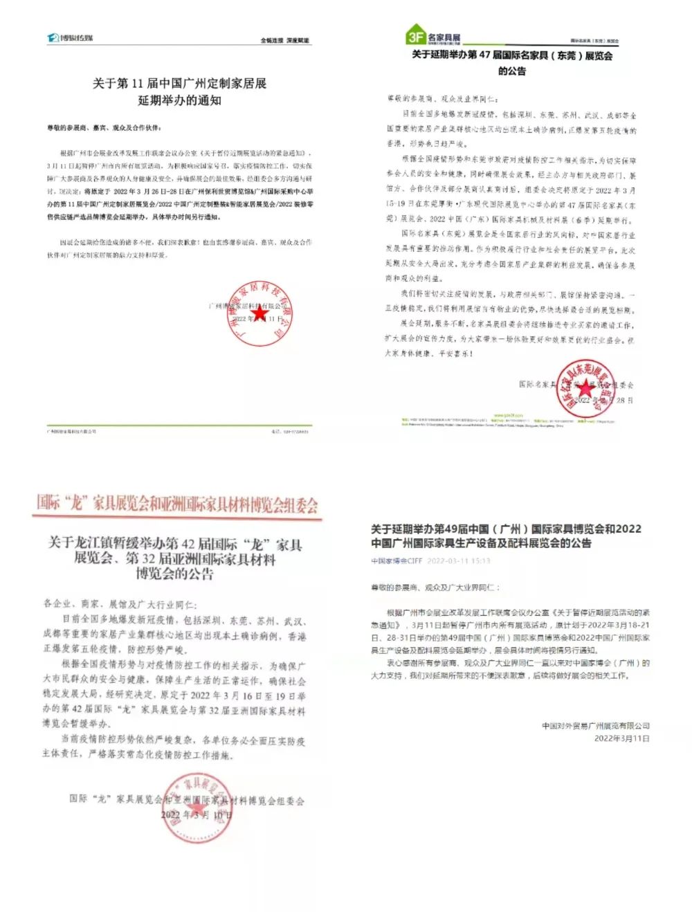 随后,原计划于3月份举办的第49届中国(广州)国际家具博览会、2022中国广州国际家具生产设备及配料展览会、第11届中国广州定制家居展等展会主办方均发布了展会延期通知,具体时间待定。