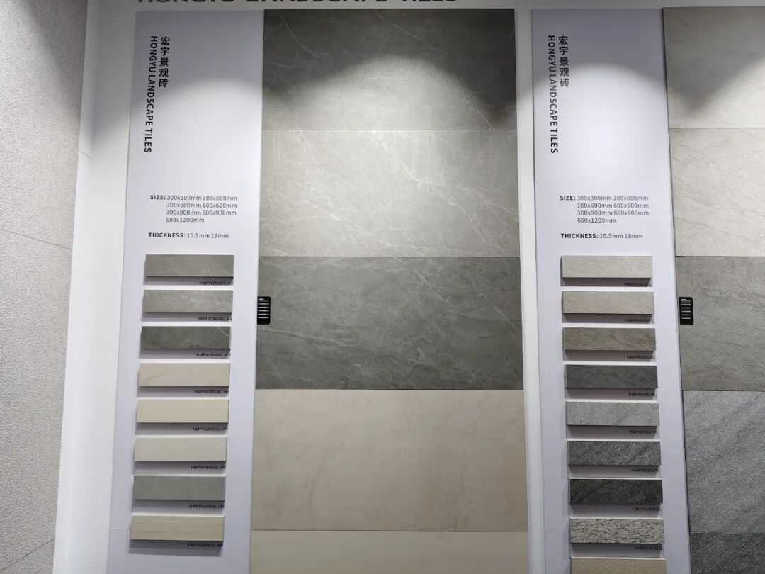 现场,宏宇重点展出了“星链计划”的产品——星钻IV代、星绣、星纹以及瑰丽石系列等,展现高端人居生活场景。展位亮点是,宏宇以 “家居场景化”为核心——把瓷砖展品融入客厅、休闲区等真实空间,搭配樱花树、绿植等柔美元素,让“星际质感”落地为可触摸的生活场景,既展示了产品的应用效果,也弱化了商业展陈的生硬感。