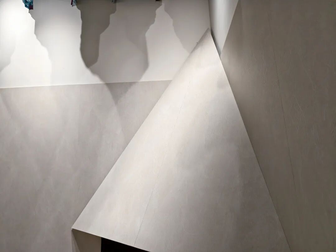 在核心展区,玛缇以白色大型展台为视觉中心,展台造型简约,既最大化展示了林学明·L系列、曾建龙·龙系列、孟也·M系列、女书系列、马毛系列、阿玛尼系列等明星款瓷砖产品的质感,又不会抢镜;顶部用悬浮式柔光顶配合梯子呼应了展馆主题,弱化了商业展陈的生硬感,反而带出一种“设计工坊”的松弛氛围,让产品呈现更自然。