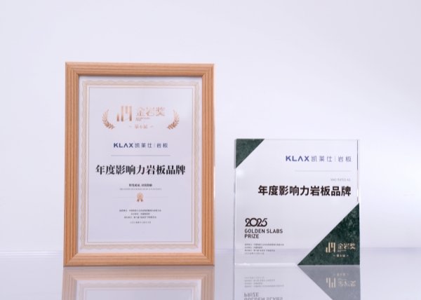 在备受瞩目的“金岩奖”颁奖环节,金意陶集团旗下高端岩板品牌——KLAX凯莱仕岩板凭借其卓越的品牌影响力、技术创新能力和终端交付实力,荣获第六届金岩奖“年度影响力岩板品牌”荣誉称号。