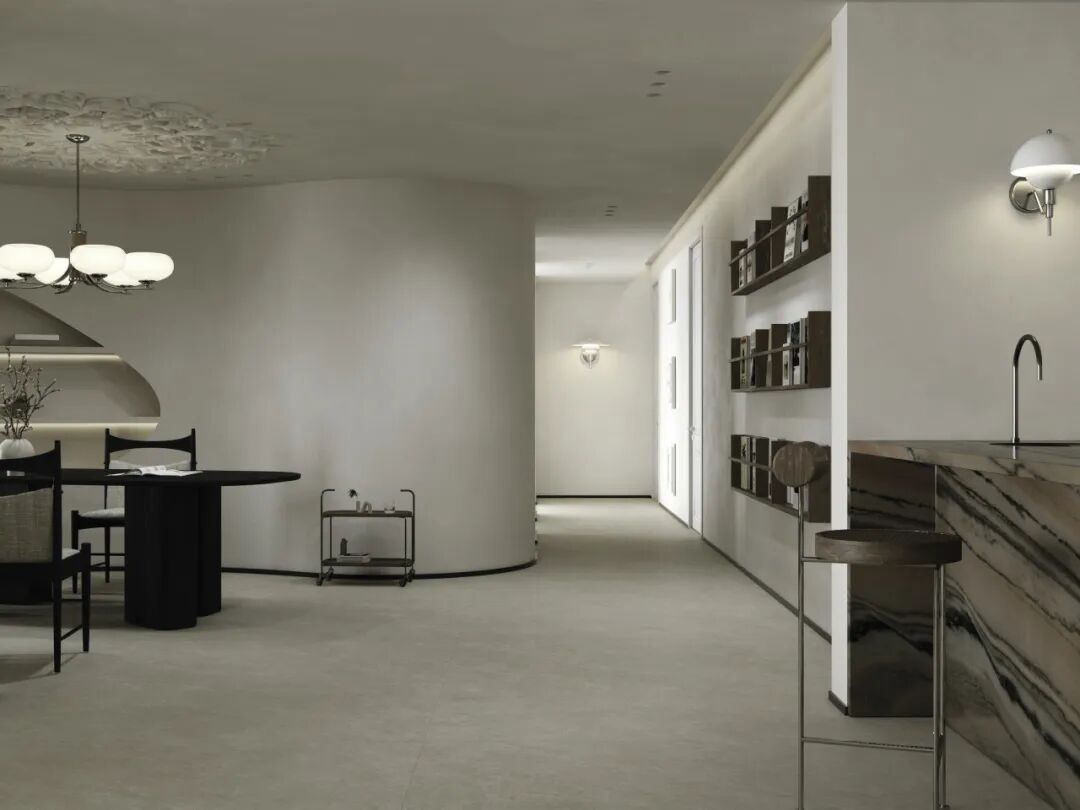 客餐厅空间通铺觅境系列-疏影 TWX918355,复刻天然石材的肌理,深浅交错的纹路如风蚀水刻的痕迹,赋予空间独特的自然气息。