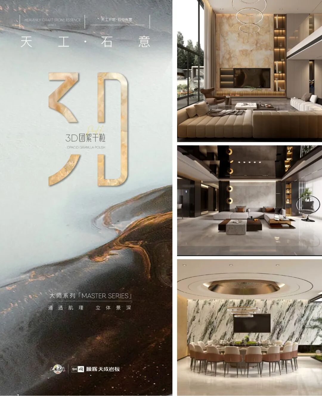 顺辉天成岩板《大师系列》包括岩纪木象与天工石意两大子系列,深度融合数码模具5.0、3D团絮干粒抛等前沿工艺,实现了岩板“肌理造骨”与“立体景深”效果的突破性呈现。该系列产品以技术还原自然之美,将石材的磅礴与木材的温润刻画得淋漓尽致,重新定义了高端岩板的美学与实用价值。