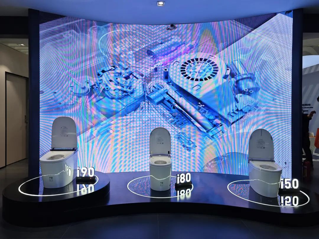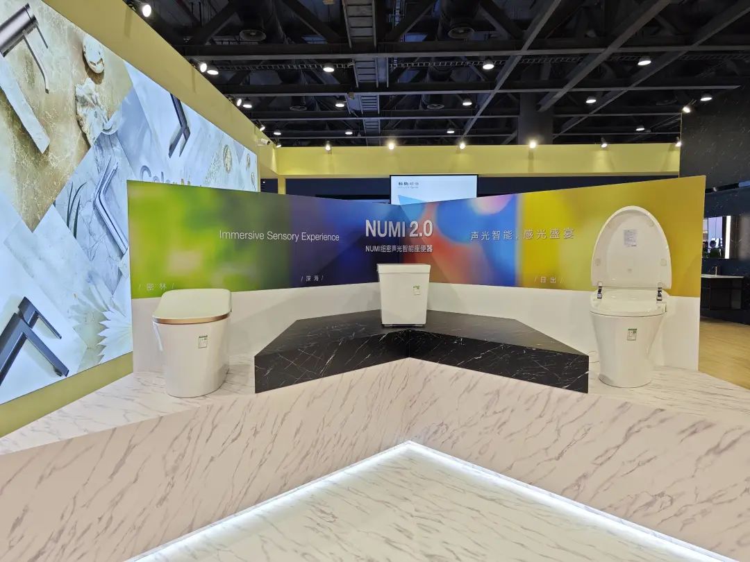 九牧在展台中心设置了智能马桶展示区,其中i90全水路除菌数智马桶格外抢眼。九牧还搭建了与华为鸿蒙系统联动的场景化数智卫浴空间,以及获得红点奖、德国创新奖的SENSA系列,同样吸引大量观众驻足观看。