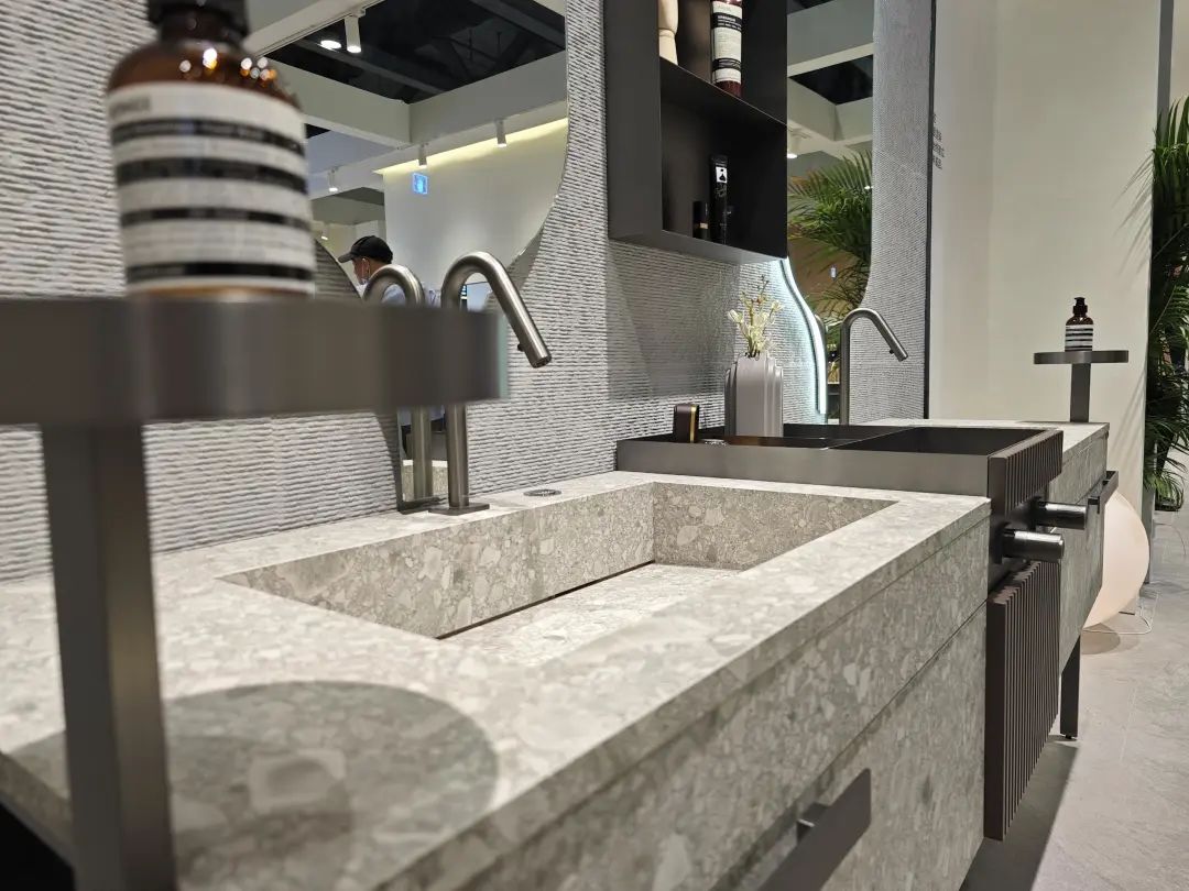 参展主题是“全卫设计,设计引流”,除展示ONE系列、META系列等多款智能马桶,还带了智能浴室柜、智能面盆龙头等一系列智能卫浴单品。