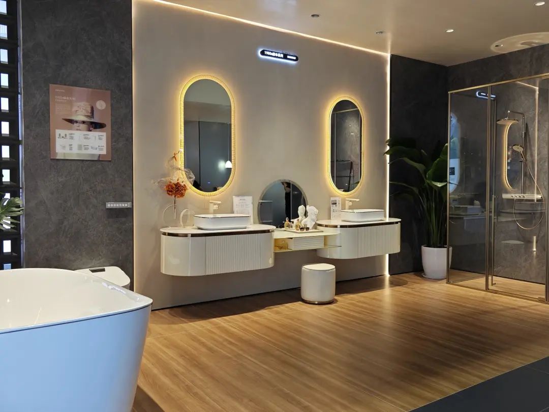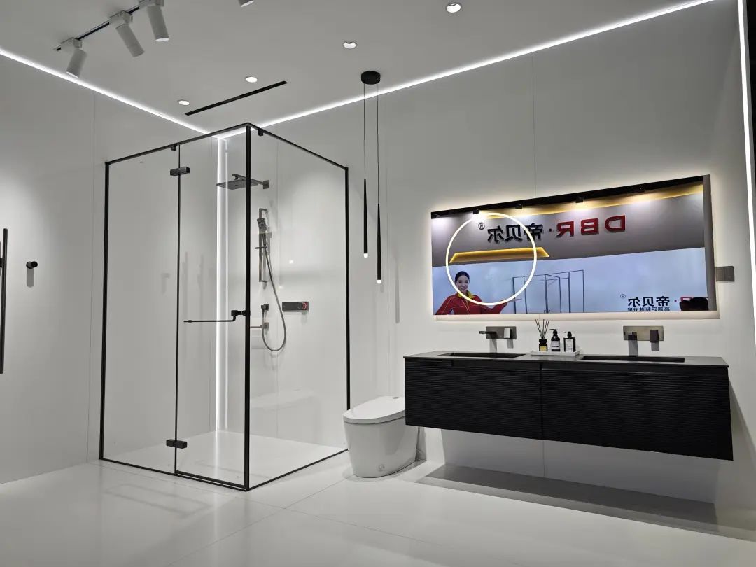 德立主力展品为客制化选项丰富的开放式浴室,其中浴室柜有10多种颜色可选。