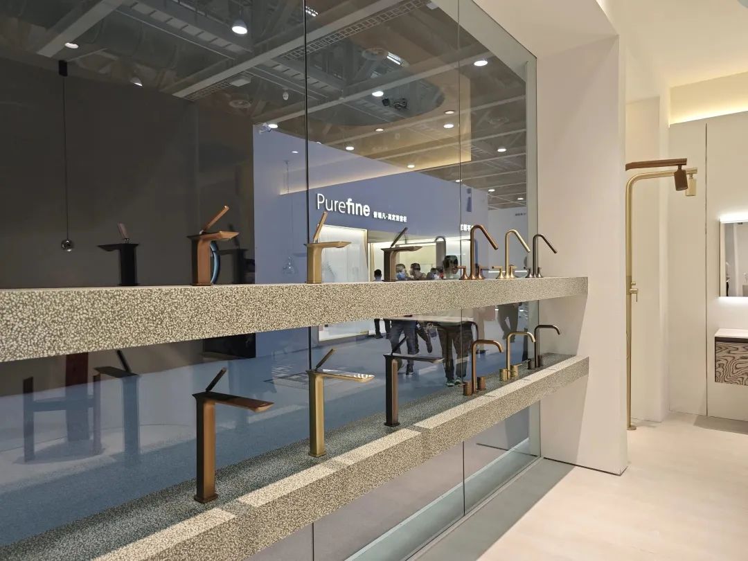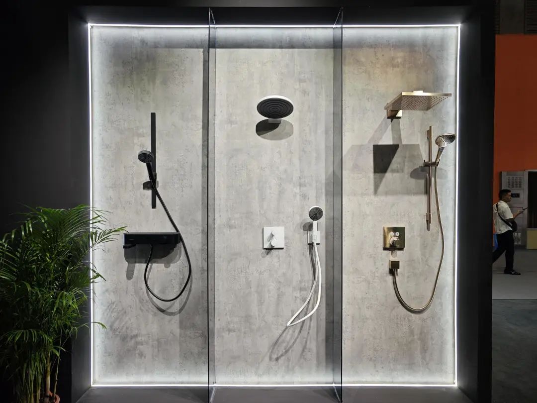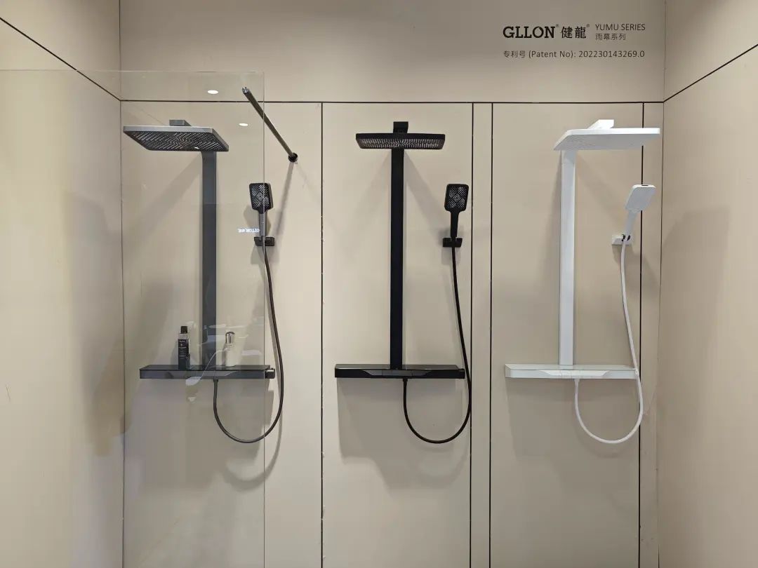 展品以淋浴花洒为主,主力产品为安装淋浴系统,多款产品都有黑、白、金等数种饰面。