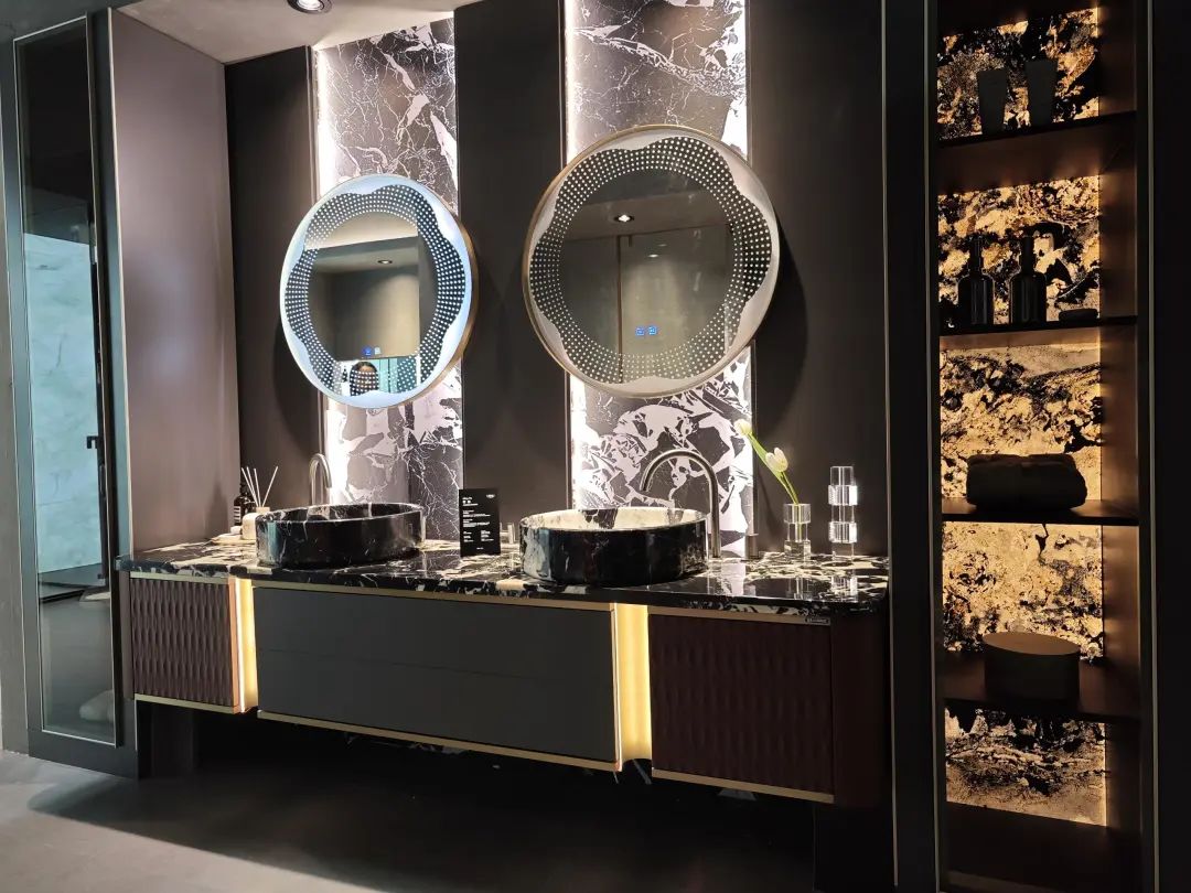 以淋浴房起家的玫瑰岛,展台设计同样以玫瑰为特色,营造神秘绚丽的空间氛围。展品方面,除了展出淋浴房外,还带来了大量浴室柜新品。