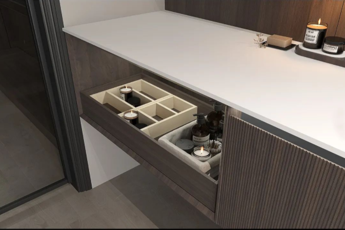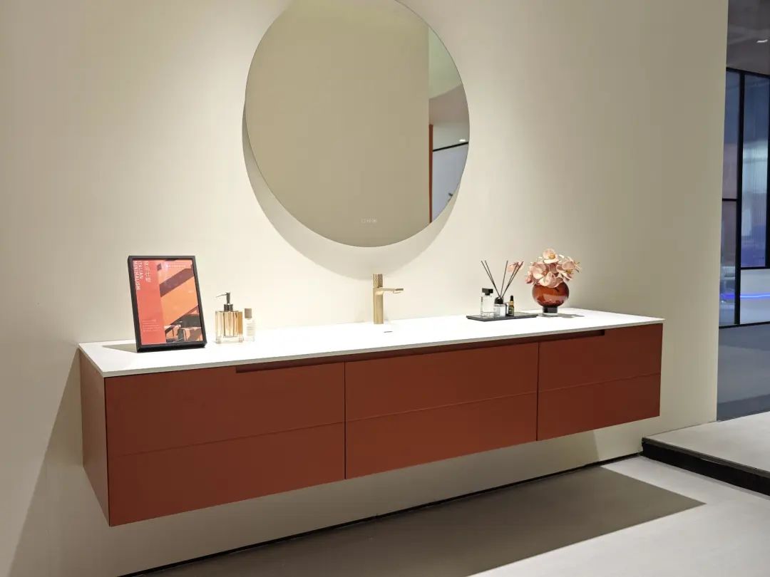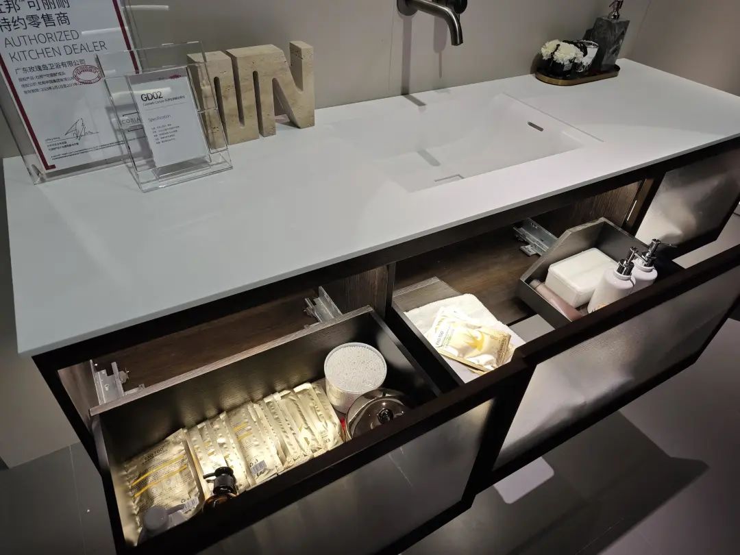 普瑞凡主推“高定浴室柜”,带来了一系列浴室柜新品,其中一款采用分体式断层设计,显得优雅大气。