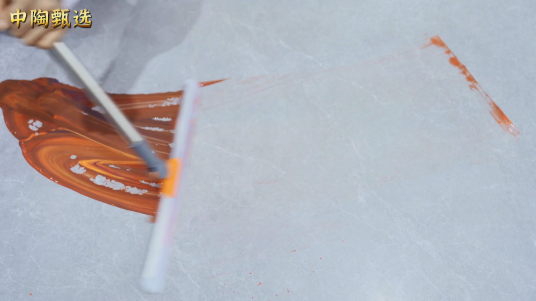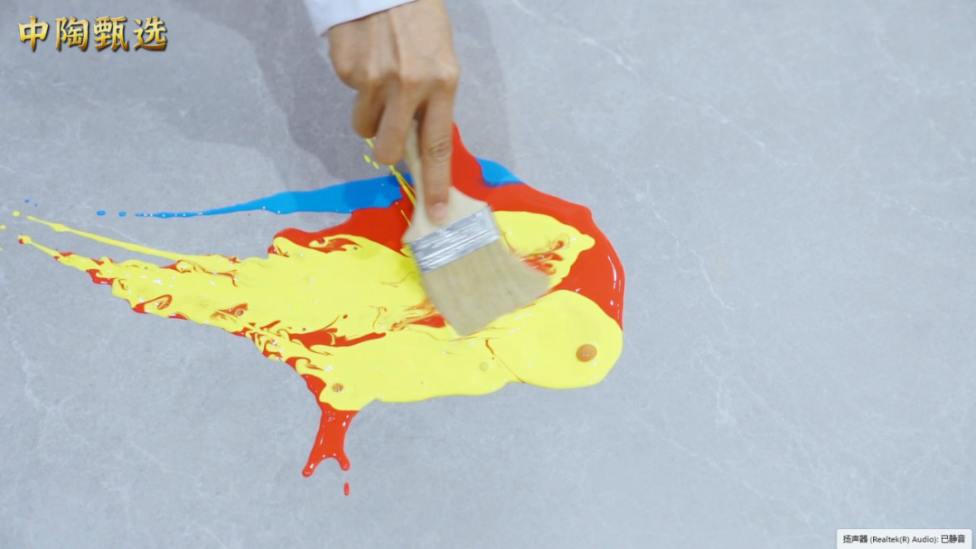 为测试质感大师的防污性和易清洁功能,我们将水粉颜料直接用力甩在砖面上,再用画笔涂抹均匀,静置半个小时。接下来,只要洒水沾湿,用魔术扫把一刮,污渍马上消失得无影无踪。