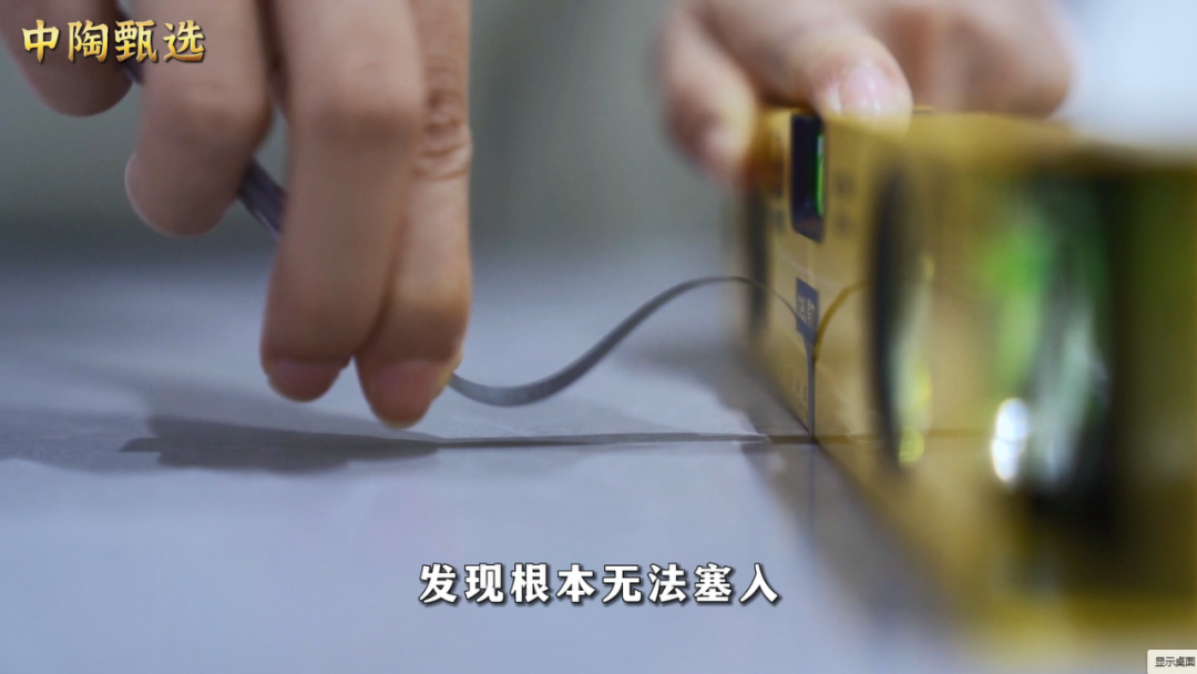 质感大师所采用的超细干粒比头发丝还细,整块砖面摸上去的手感非常细腻平顺,一点都没有颗粒感和凹凸感。实验出真知,为了了解质感大师砖面是否存在凹凸不平,我们用0.02mm厚的塞尺测试瓷砖和水平尺之间的缝隙,发现根本无法塞入,砖面平整度一流。