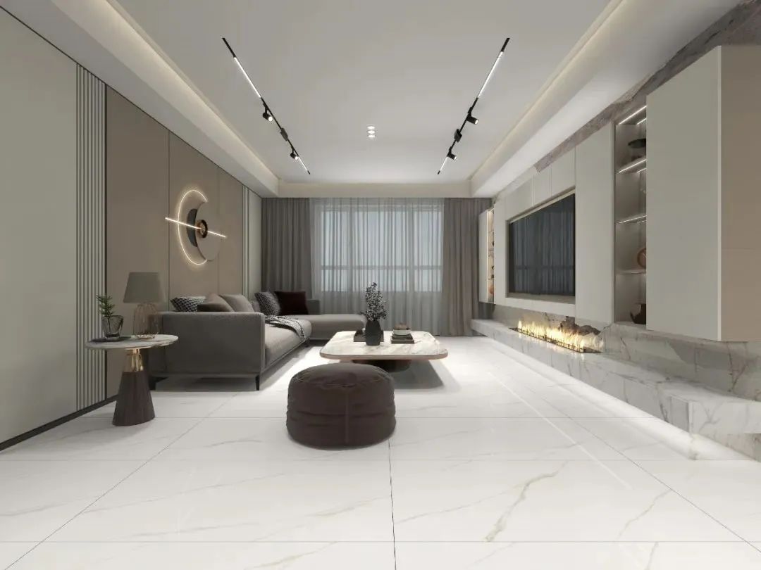 轻奢风格的瓷砖选择可以有两种思路。第一种,以高级灰、浅咖色等低饱和度的柔和色系地砖,搭配撞色背景墙和金属、皮面家具软装。地砖还可以设计波打线或拼花,珍稀石材纹理岩板可以作为背景墙,提升高级格调。