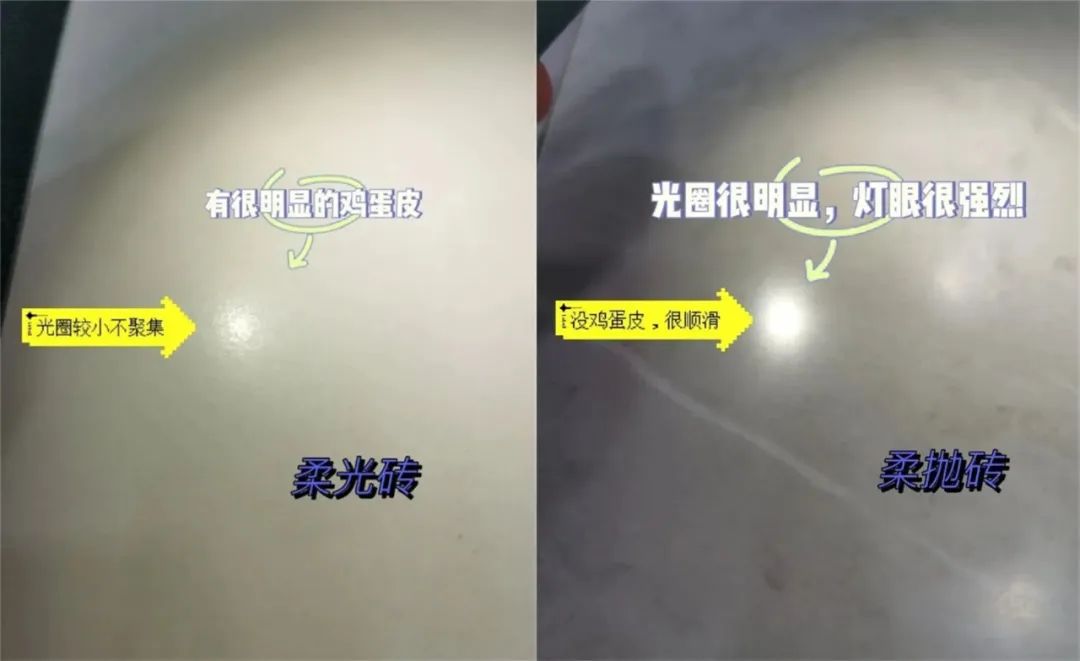 在选购时,可以用强光照射瓷砖,看瓷砖表面光圈大小。若光圈较小且不集中、不刺眼,表面有类似于鸡蛋皮的质感,说明是柔光砖;光圈很刺眼且表面顺滑光亮,说明是柔抛砖。