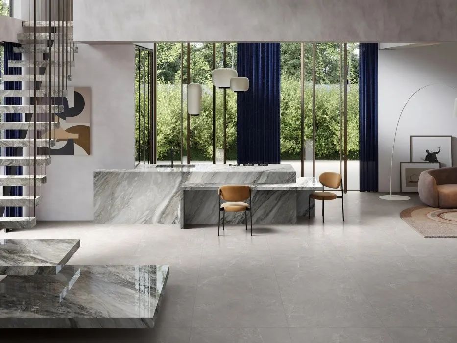 维罗将自然气息融入到年度质感新品生态自然石系列之中,以理石、砂岩、水磨石等元素为设计灵感,复刻自然的原生脉络。目前该系列包括玛雅-米黄/浅灰/中灰、繁星-中灰/深灰、西西里-米灰/暖灰/烟灰8款产品,均为750×1500㎜的黄金规格。